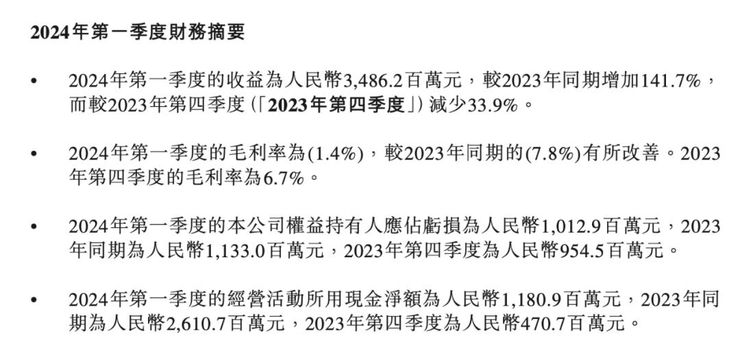 零跑汽車2024年一季度財務摘要,圖源零跑汽車一季度財報