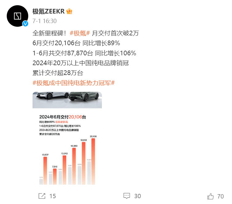 今年的7月1日,極氪率先公佈了其6月交付量為20106輛,同比增長89%。這也是極氪首次月交付“破2”,具有里程碑意義。