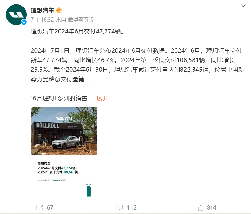 兩分鐘後,理想公佈了月銷47774輛的成績,力壓問界的43146輛,再次蟬聯了新勢力的月銷冠。理想2024年前半段的總銷量來到了188981輛,也高於問界的181197輛。