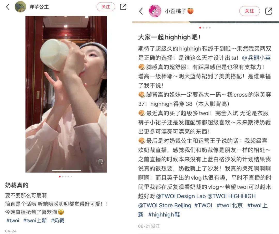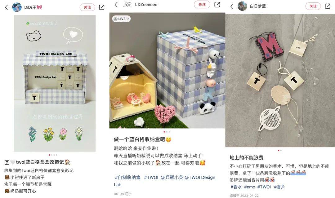 正因為TWOI的每件衣服都是“有靈魂的”,用户們會對其傾注超乎尋常的感情。很多女孩會給TWOI的服裝配飾專門準備一個衣櫃,收貨的第一時間,就會迫不及待上身分享,像“奶裁”一樣展示自己的漂亮穿扮。很多喜歡TWOI的女生還彼此互相吸引,因為衣服而結識併成為朋友。不僅如此,對於TWOI經典藍白格風格的包裝盒,用户甚至掀起了一股DIY風潮。很多女孩會把TWOI包裝盒做成各種形式的首飾收納盒,把木吊牌做成香薰吊卡、冰箱貼,還會踴躍分享這種DIY的美好,吸引更多女孩加入其中。