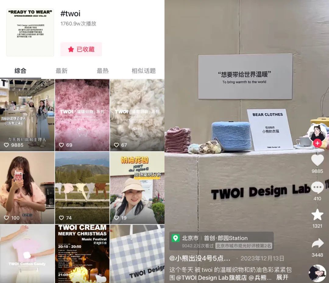 由於核心團隊的精力有限,雖然早就注意到抖音在年輕用户中的號召力,TWOI直到2022年進入抖音市場。在這裏,它找到了迅速脱穎而出的獨家優勢,那就是“兵熊小英”獨特的奶油風。TWOI並未把抖音作為一個單純賣貨的平台,而是一個傳播品牌聲量的地方,吸引真正認可、喜愛TWOI理念的粉絲。