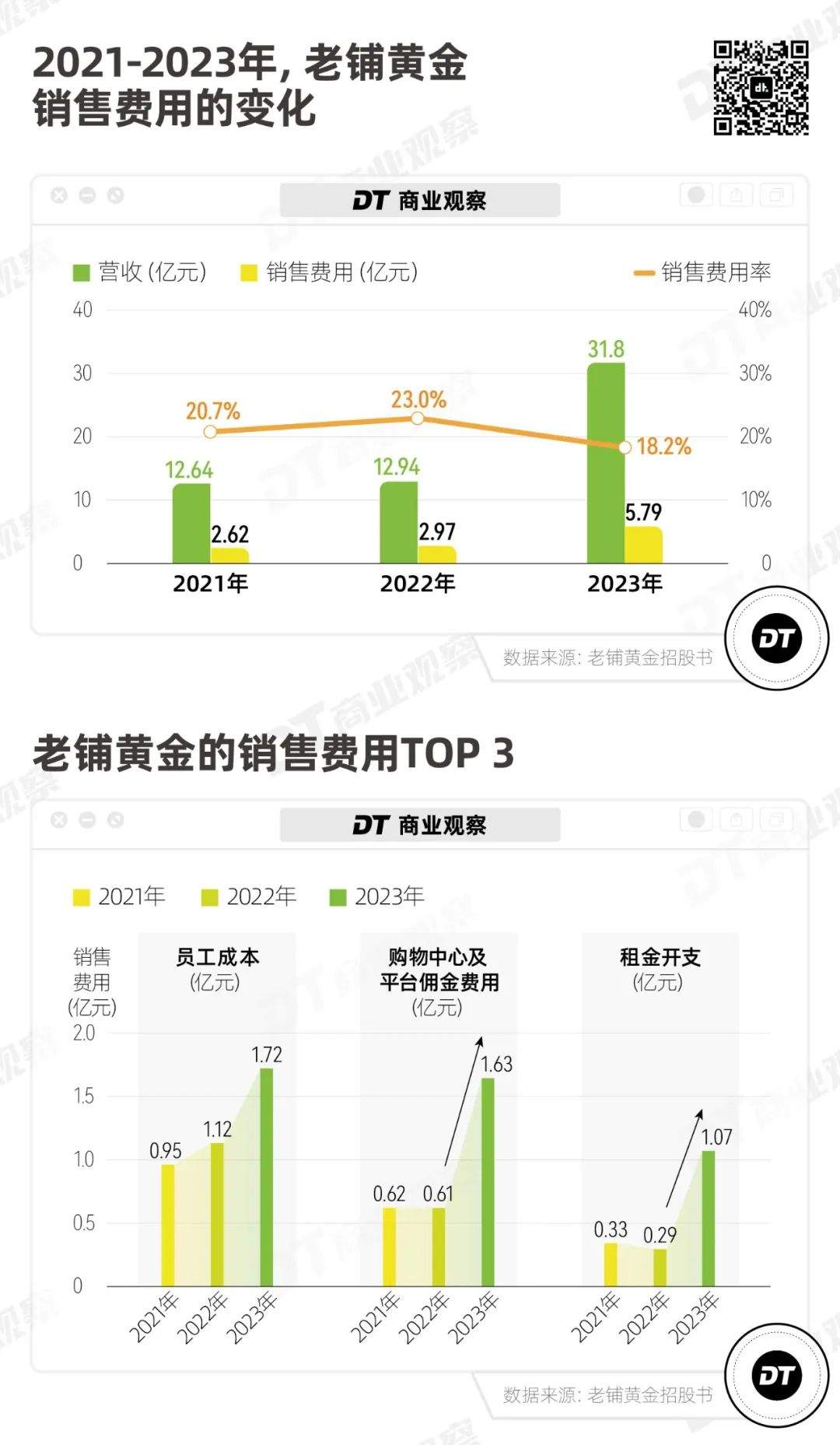 從2021到2023年,老鋪黃金的銷售費用翻了一倍,從2.6億元漲到5.8億元,其中漲幅最多的兩項分別是購物中心及平台佣金費用、租金開支。