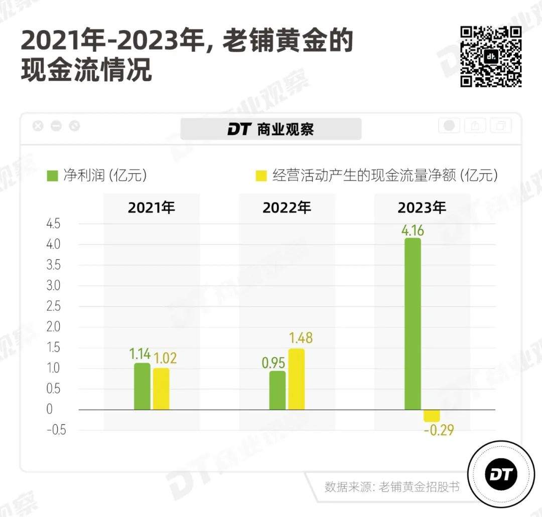 2023年,**老鋪黃金的淨利潤雖然大幅增長,但經營活動產生的現金流淨額經營活動所得的現金流淨額卻呈現負值,**從之前的1億元、1.5億元,下降到-2920萬元。
