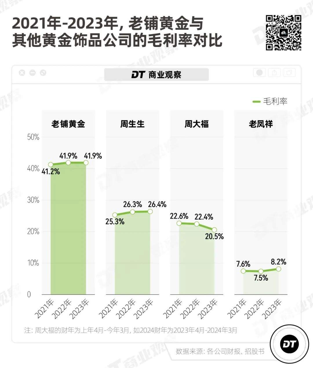 從2021到2023年,老鋪黃金的毛利率穩定在41%以上,周生生的毛利率徘徊在25%-26%左右;周大福的毛利率從22.6%降到20.5%;老鳳祥的毛利率則不到10%。