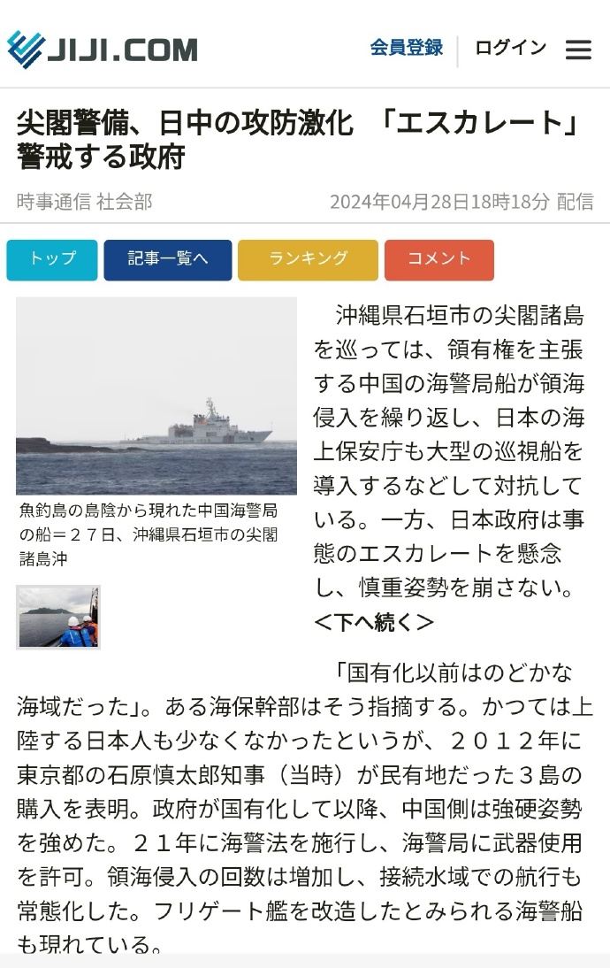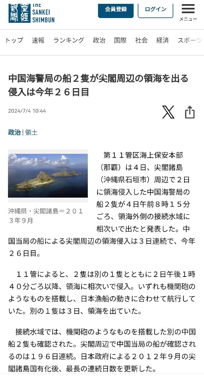🔹《產經新聞》今天報道,我海警船今年進入領海 26次,創下自2012年9月以來,毗連區內連續巡航 196天的記錄。(圖3)