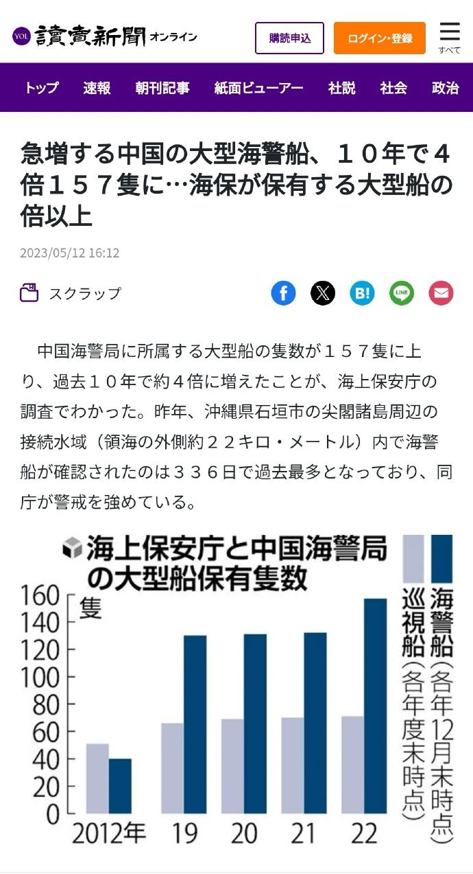 🔹《讀賣新聞》曾報道,截止2022年底,我大型執法船(1000噸以上),十年裏激增到原來的四倍(40艘增加到157艘)。是日海大型船數量(71艘)的兩倍多。(圖5)