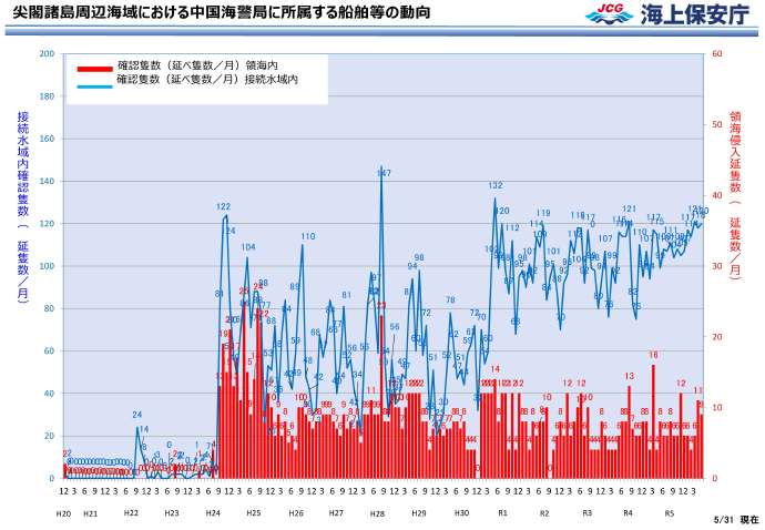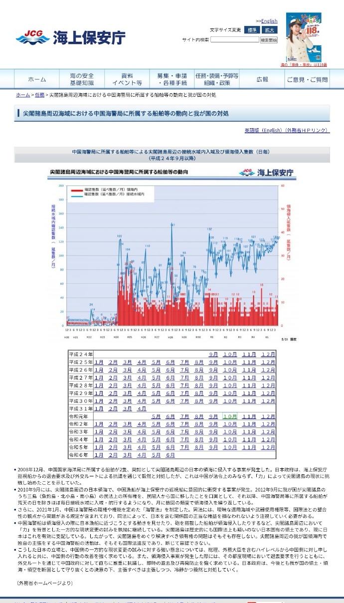 (中國海警局等に所屬する船舶が荒天の日を除きほぼ毎日接続水域に入域·航行するようになり、月に數回の頻度で領海侵入をている。)(圖1,圖2)