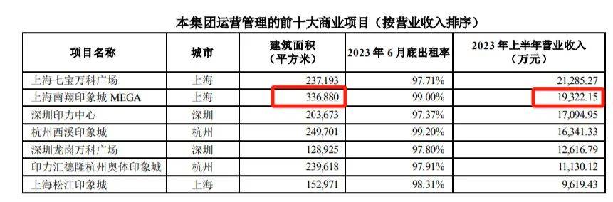 該項目由印力集團和新加坡GIC集團合作開發。根據萬科半年報顯示,南翔印象城MEGA建築面積約33.69萬平方米,體量在該公司旗下已開業的商業項目中位列第一。2023年上半年,該項目出租率高達99%,實現營業收入1.93億元,僅次於七寶萬科廣場的2.13億元。