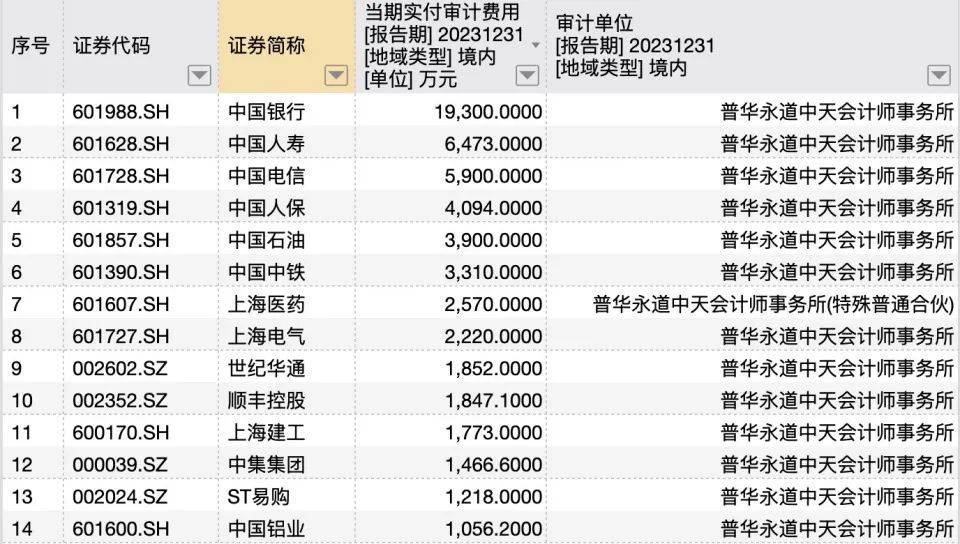 而對於普華永道極為重要的審計客户多數已經流失。2023年度,普華永道超過1億元的客户有1家,是中國銀行,實付審計費用為1.93億元;實付審計費用超1000萬元的公司有14家,其中前八大客户均已公告與其解約。據Wind數據計算,這8家A股公司2023年就為普華永道貢獻了4.78億元審計費用,已超過其審計收入的一半。