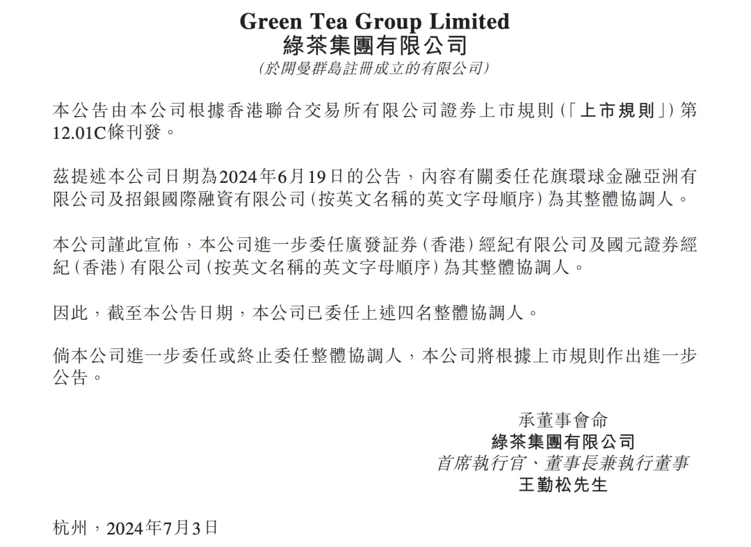 7月3日,港交所文件顯示,綠茶集團有限公司進一步委任廣發證券(香港)經紀有限公司及國元證券經紀(香港)有限公司為其整體協調人。據此,截至本公告日期,公司已委任花旗、招銀國際、廣發證券(香港)與國元證券(香港)為其整體協調人。