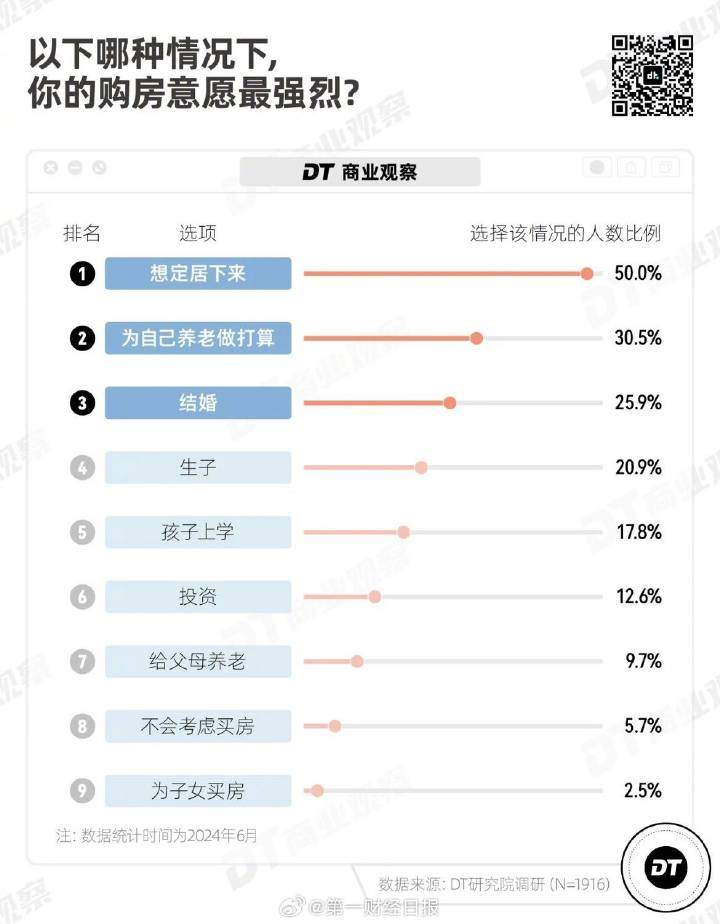 《DT商業觀察》的調研數據顯示,50%的人買房是為了在一個城市安定下來,30.5%的人是為自己養老做打算,接下來才是為了結婚、生子、孩子上學等。