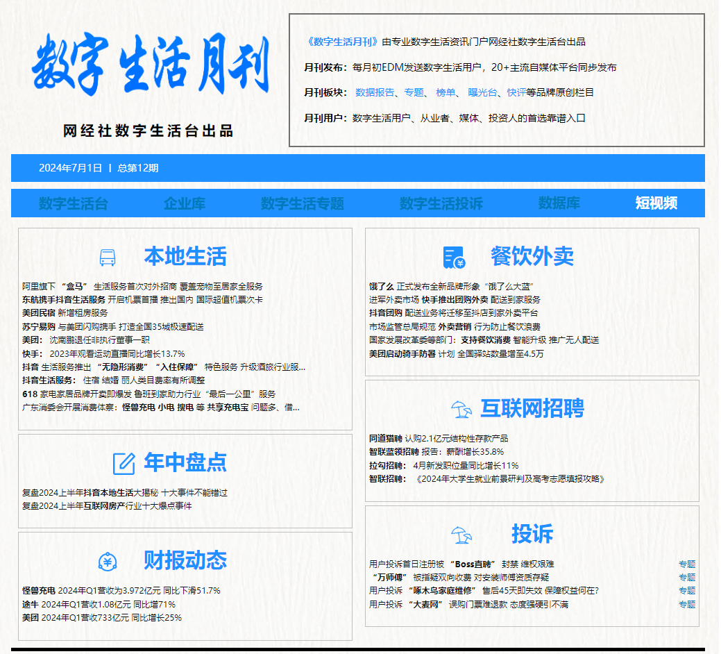 2024年6月,數字生活領域又有哪些事?以下為網經社數字生活台為您帶來本月本地生活、在線外賣、家裝租聘、數字文娛等賽道最新動態回顧。