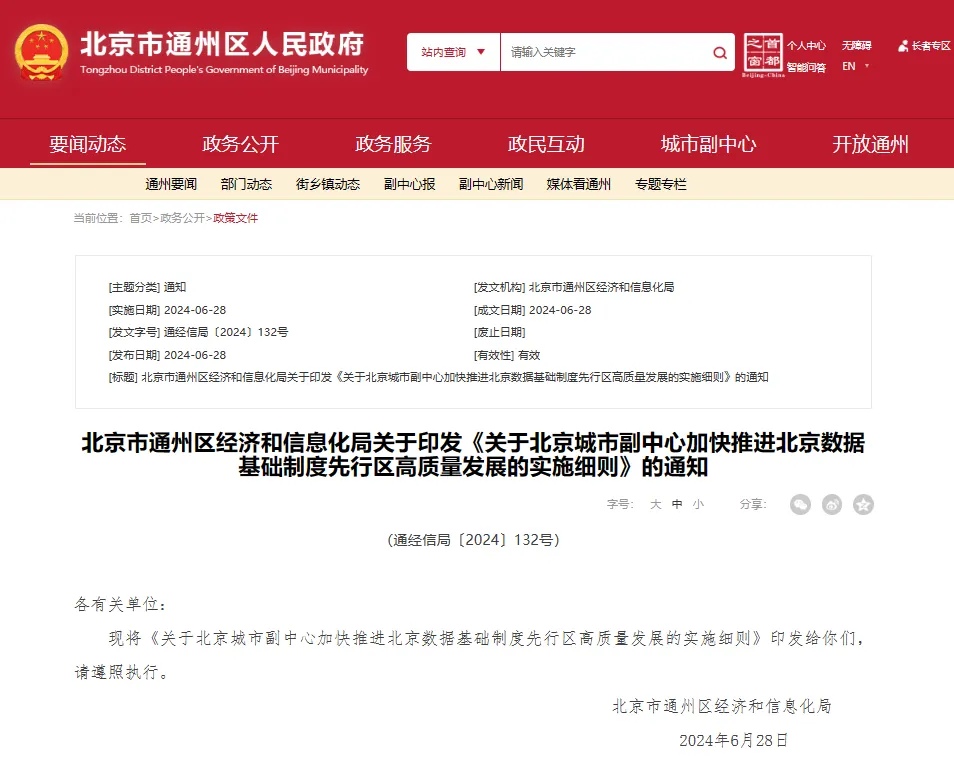 6月28日,北京市通州區經濟和信息化局印發**《關於北京城市副中心加快推進北京數據基礎制度先行區高質量發展的實施細則**》。