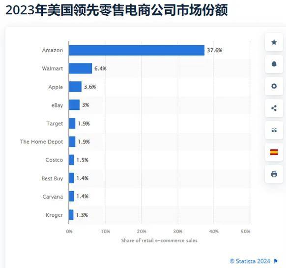 首先,高市場佔有率意味着龐大的用户基礎、更強的議價能力以及更廣闊的收益空間,這是跨境賣家在選擇出海渠道時的關鍵指標。以美國市場為例,Statista發佈的最新數據顯示,在大廠集聚的美國市場,亞馬遜仍能以37.6%的絕對優勢穩居市場份額第一,斷層領先其他平台。