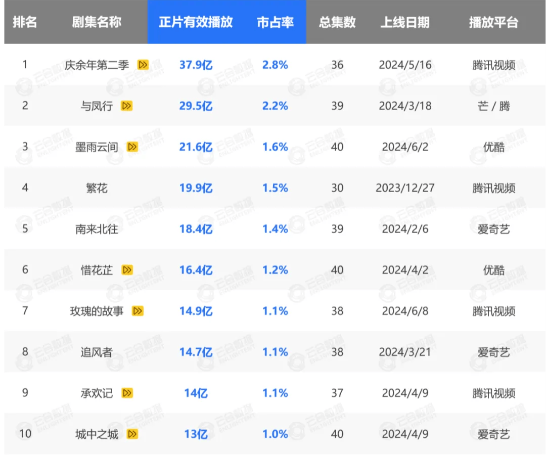 同時,根據雲合數據顯示,2024H1全網劇集有效播放第一名為37.9億的《慶餘年2》,雖然相較於去年一位《狂飆》的102.1億有較大差距,但2024H1排在第二-五位劇集的正片有效播放都超過去年第三位《向風而行》的16.6億,且第六位《惜花芷》正片有效播放也達到16.4億,與《向風而行》基本持平。