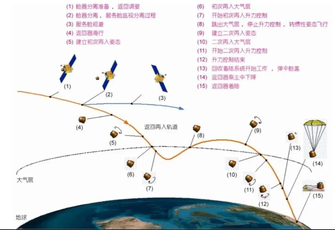 另一種再入方式就是跳躍式再入了,也就是所謂的“打水漂”,返回艙再入高層大氣之後,利用氣動力控制返回艙在高層大氣中“漂”一下,反彈回外層空間,然後再二次再入,利用這種“打水漂”的空間來給航天器減速,這也是嫦娥五號和嫦娥六號使用的再入方式。