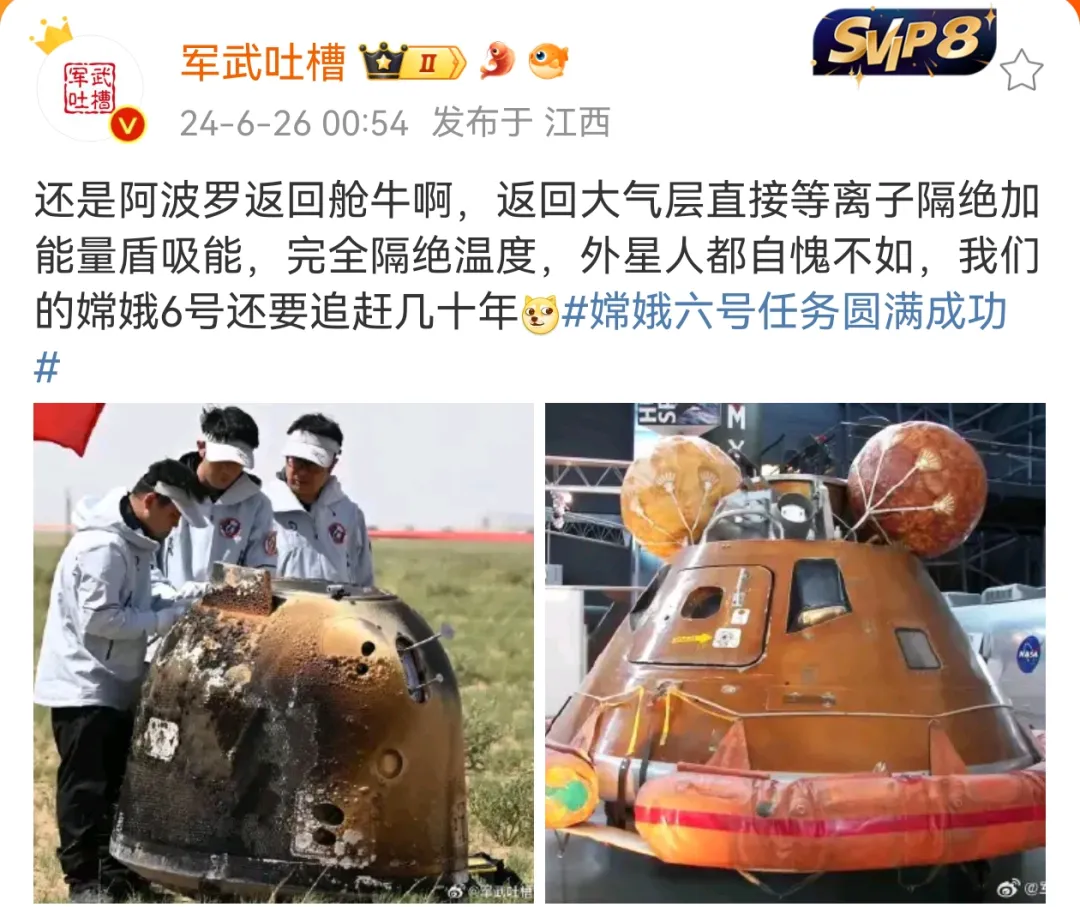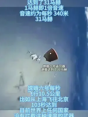 網上的雞血又開始打起來了!這幾天,不知道從哪兒傳出來的,説咱們的嫦娥六號月球探測器,從月球返回再入地球大氣層時,達到了“31馬赫”的速度。