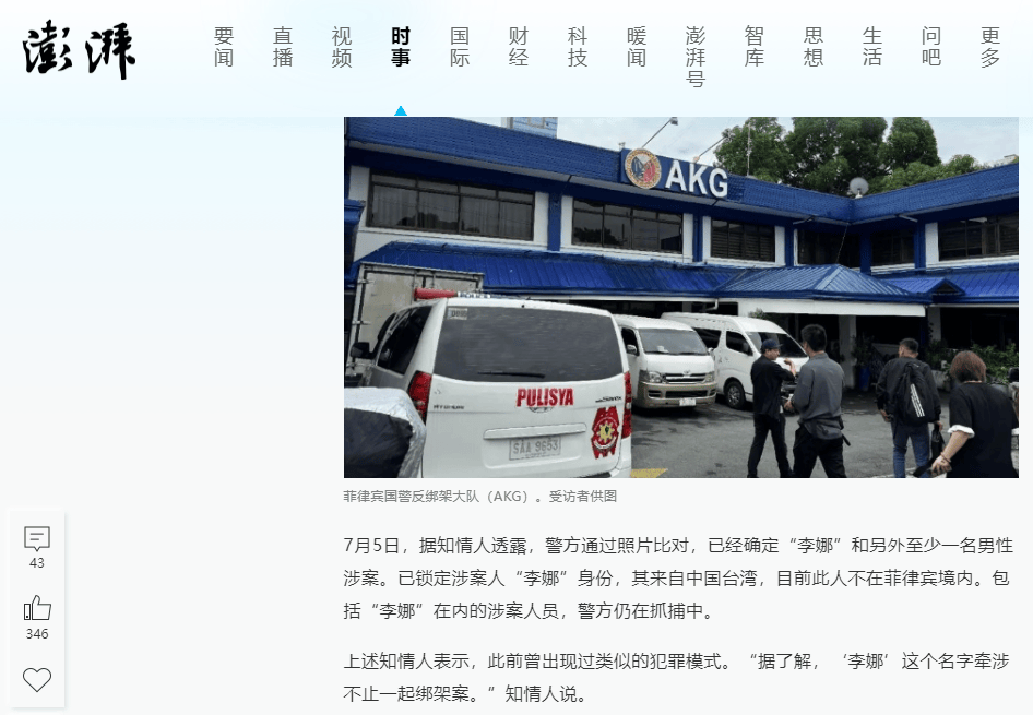 另據澎湃新聞報道:7月5日,知情人透露,警方通過照片比對,已經確定“李娜”和另外至少一名男性涉案。已鎖定涉案人“李娜”身份,其來自中國台灣,目前此人不在菲律賓境內。包括“李娜”在內的涉案人員,警方仍在抓捕中。