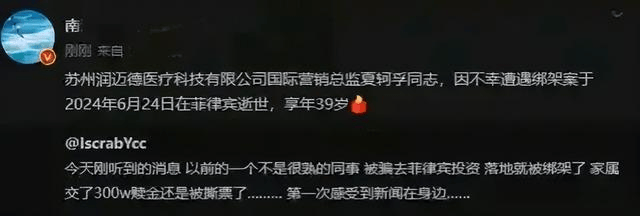 根據新聞報道,2名中國高管赴菲律賓遭遇綁架遇害,説是39歲的蘇州某醫療科技公司國際營銷總監夏某某,在今年5月14日法國巴黎歐洲心血管介入會議(EuroPCR)上,認識了同去參展的另一醫療器材公司高管孫某。