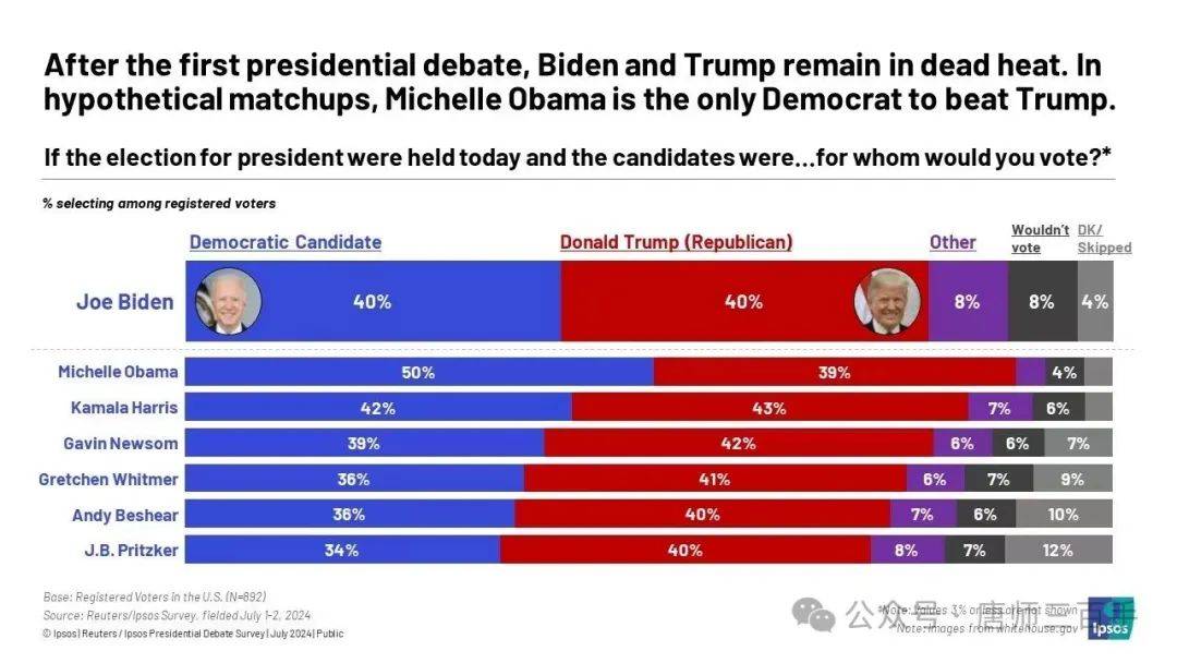 民主黨人慌了神,反覆推演,陷入兩難。在所有可能代替拜登與川普競選的潛在替代者裏,只有米歇爾·奧巴馬(前前總統奧巴馬的老婆)有勝算,可惜米歇爾無意參與公職競選。其他的潛在替代者,副總統哈里斯、加州州長紐瑟曼、密州州長懷特默等等,都不如拜登的勝算大。