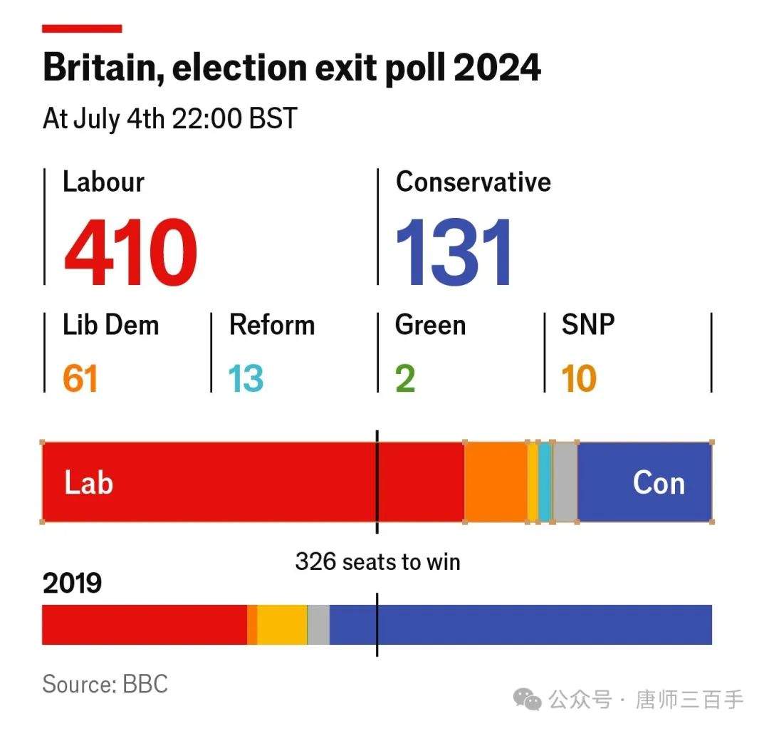 接下來是英國選舉。在野14年的工黨在議會選舉中一舉拿下410個席位,遠超組閣所需的326席的門檻。蘇納克的保守黨獲得的議席只有工黨的約三分之一(131席)。這就意味着,蘇納克的首相位置將讓位給工黨領袖斯塔默。
