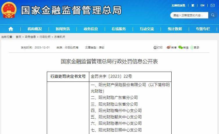 國家金融監管總局官網顯示,2023年12月,監管公佈了一則關於對陽光財險旗下多個子公司的行政處罰通知單。