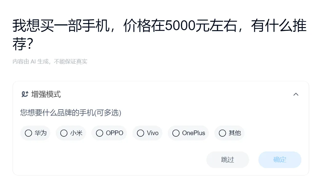 首先來看天工AI搜索的表現。再增強模式下,天工AI搜索會先反問我們想要什麼品牌的手機,這裏我們選擇跳過。