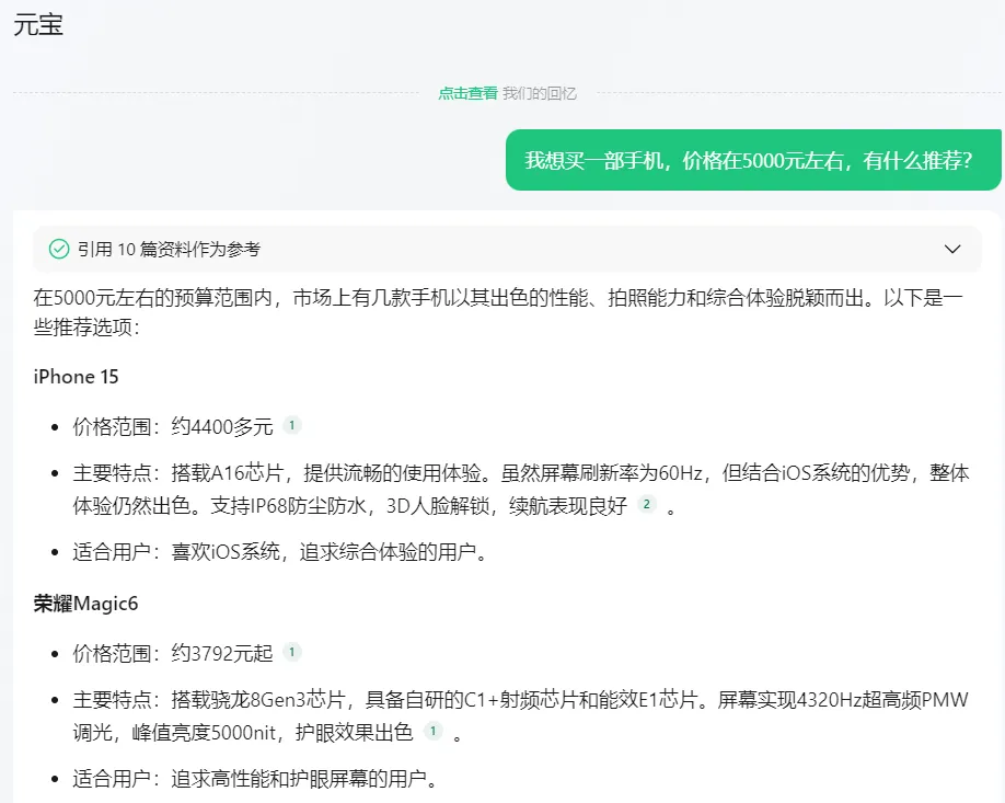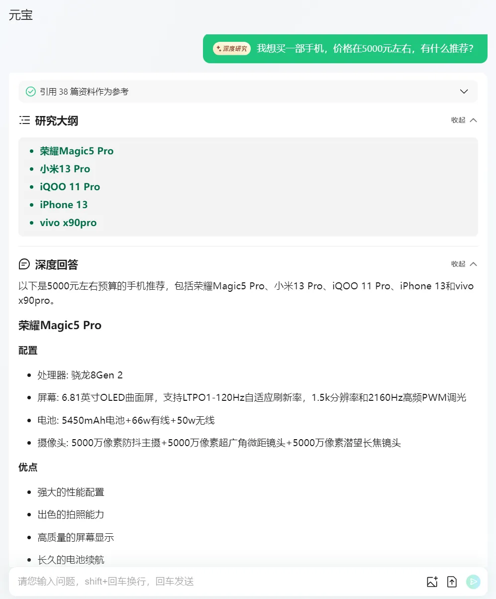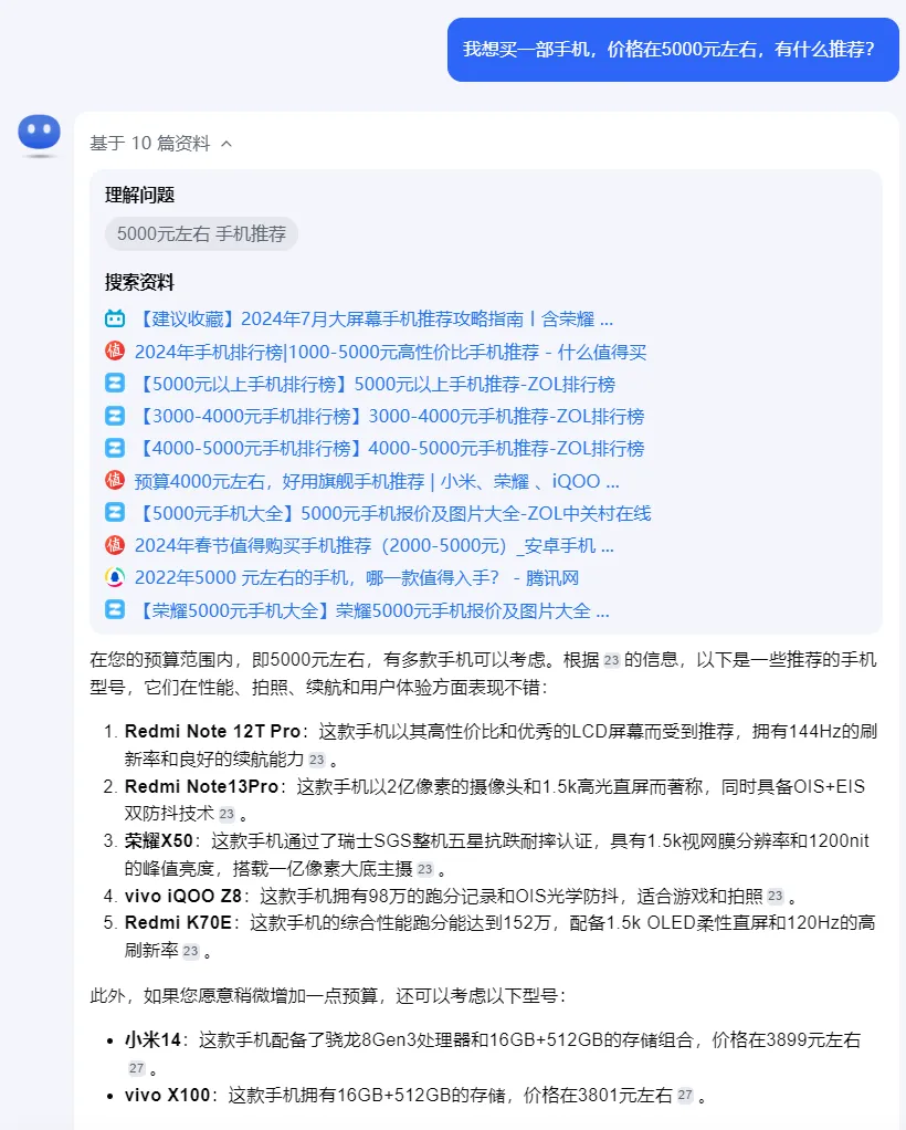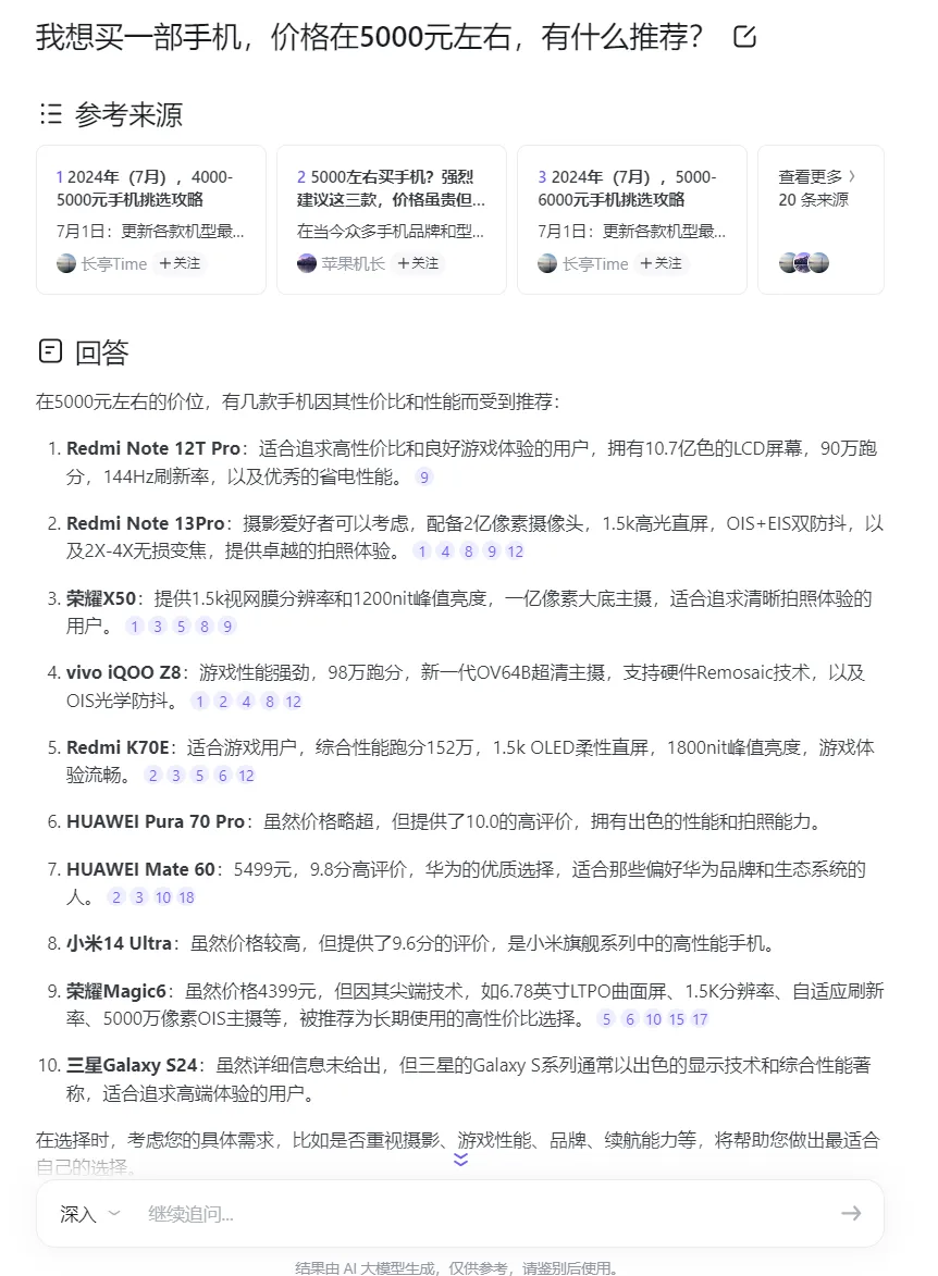 我們向天工AI搜索、知乎直答、騰訊元寶以及Kimi分別提出了同樣的問題,“我想買一部手機,價格在5000元左右,有什麼推薦?”