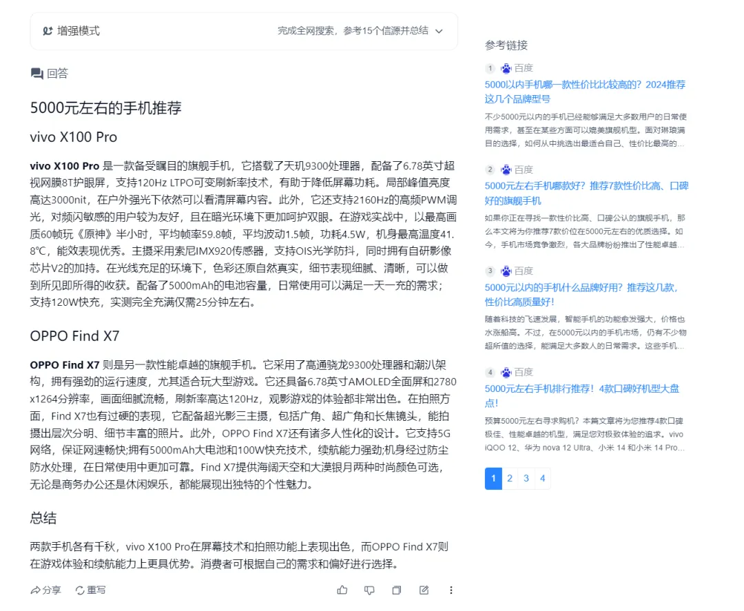 最後天工AI搜索給到的回答僅有2款手機推薦,並且還給出了推薦理由以及所參考的文章鏈接。雖然不算多,但還算滿足了我們的基本訴求。