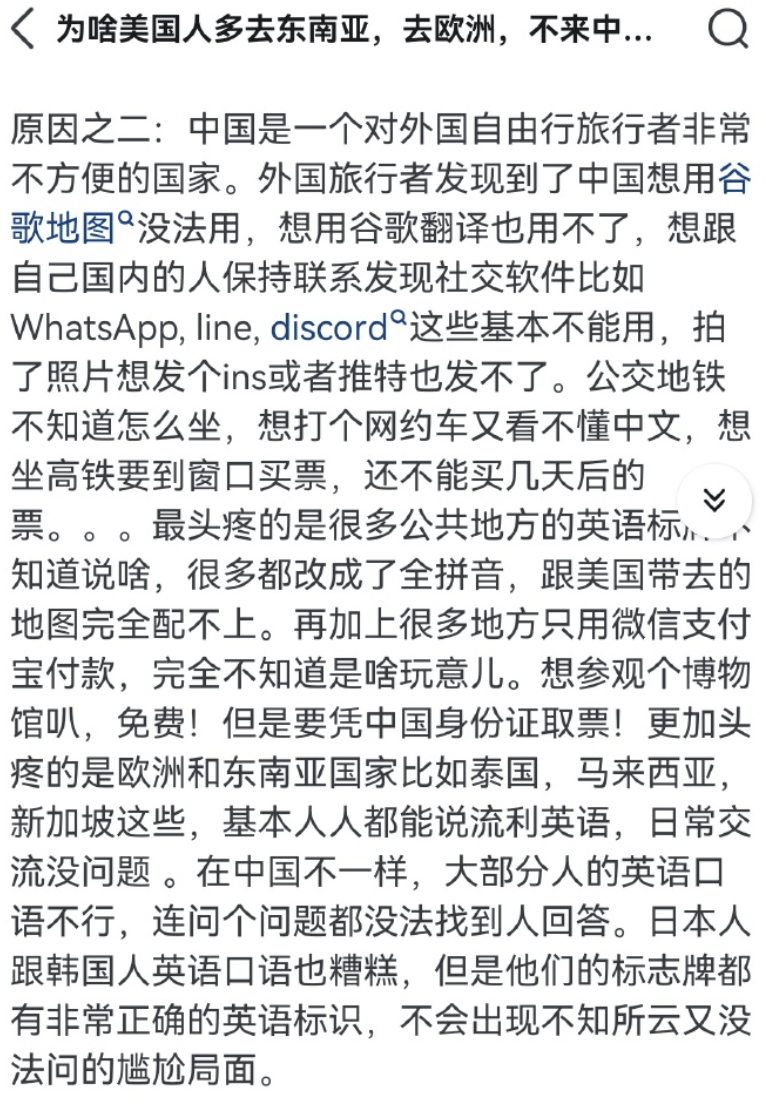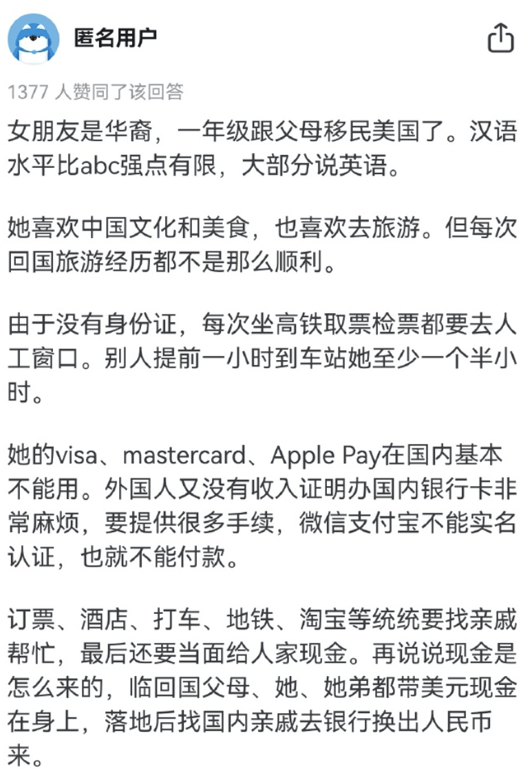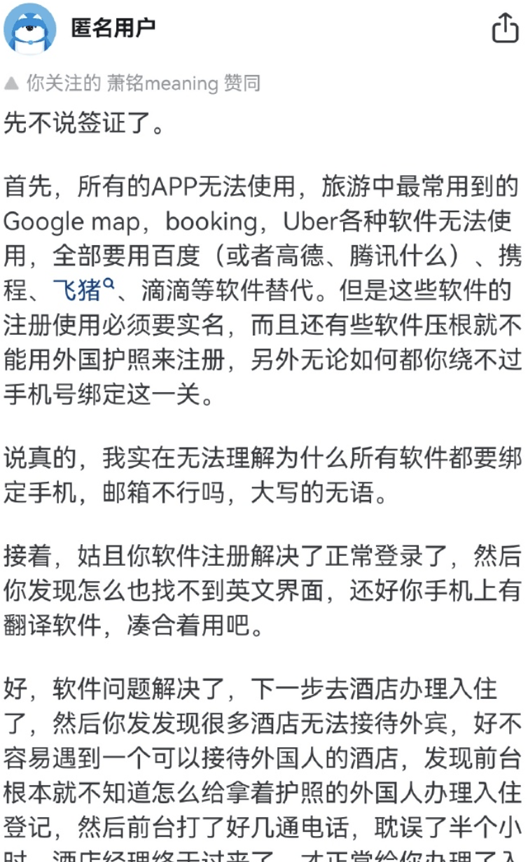 這個“外國人旅遊麻煩”的破事好像從去年下半年就開始説了,一羣人唱衰中國旅遊業,説什麼“到中國來太不方便了,又要安裝一堆APP,又要各種註冊賬號,驗證身份……人家外國人都不來了”。