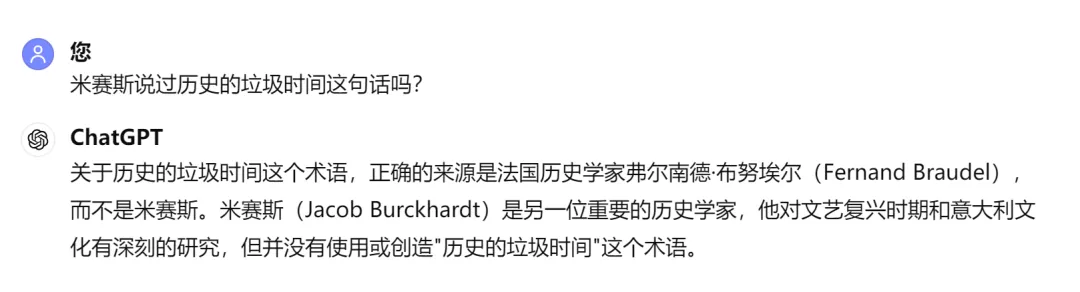 5)更可笑的是,這幫無聊的小資產階級知識分子,主要是一些不怎麼認真讀書的自媒體作者,竟然犯下了一個常識性錯誤。他們宣稱,“歷史的垃圾時間”,是由新自由主義經濟學“大師”、哈耶克的老師——米賽斯提出的。我前不久為了批判新自由主義,專門去讀了米賽斯的著作,也看了哈耶克那本被很多“文青”奉為經典的《通往奴役之路》。我完全不記得米賽斯提出過這個概念。我反覆在網上查找,最後,使用ChatGPT,得到了這個答案: