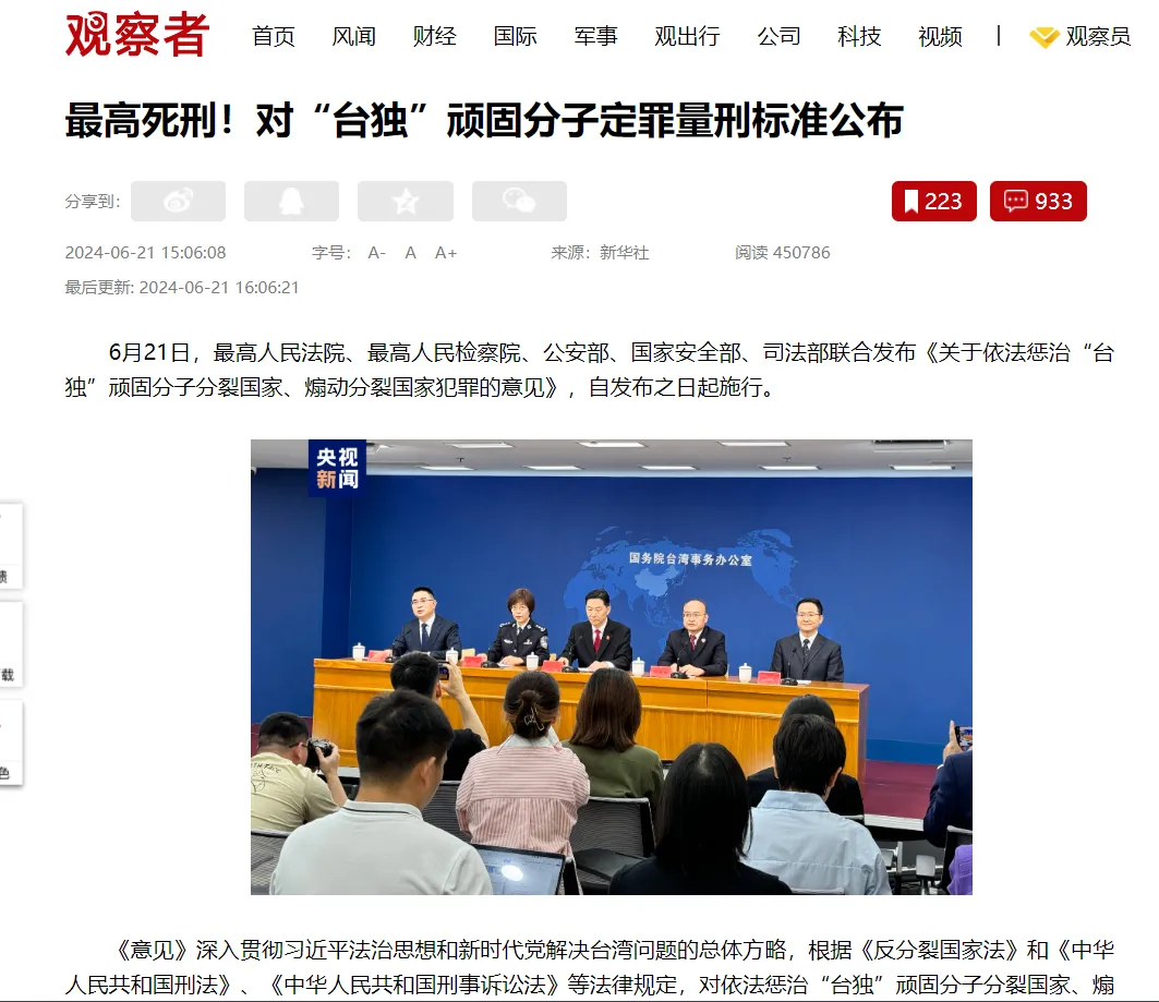 6月21日,最高人民法院、最高人民檢察院、公安部、國家安全部和司法部聯合發佈了《關於依法懲治“台獨”頑固分子分裂國家、煽動分裂國家犯罪的意見》,自發布之日起施行。
