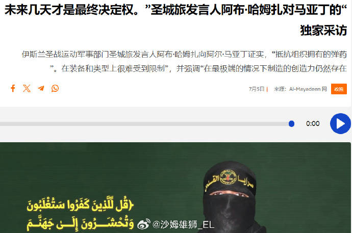 黎巴嫩Al-Mayadeen TV對巴勒斯坦“聖城旅”(傑哈德)的發言人阿布·哈姆扎進行了獨家採訪,內容如下: