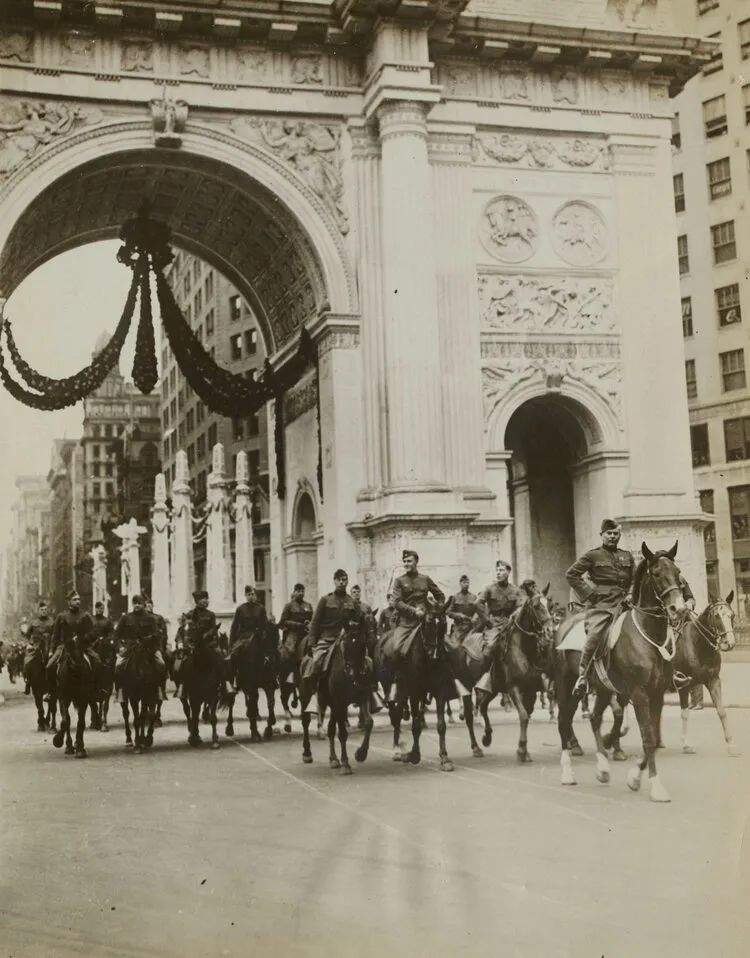 ▲1919年5月6日,亞歷山大少將一馬當先,率領第77師穿過紐約市的“勝利拱門”。