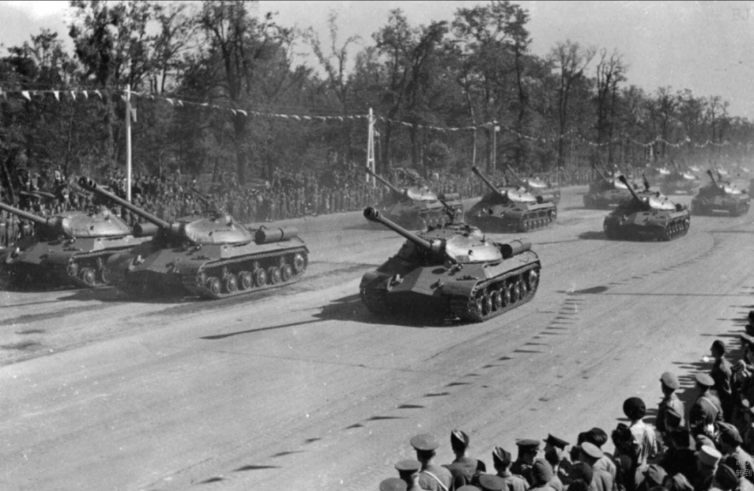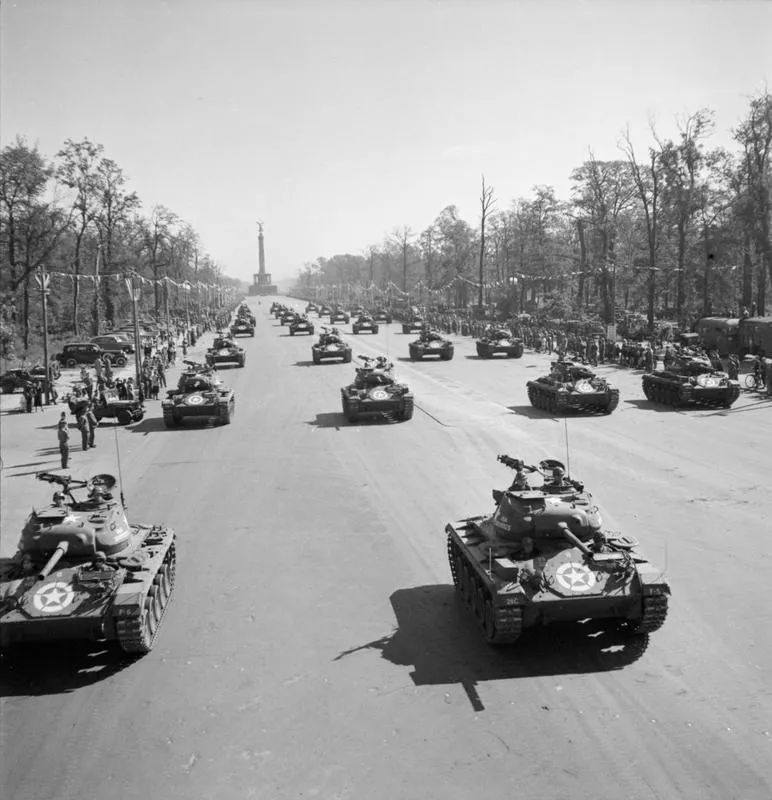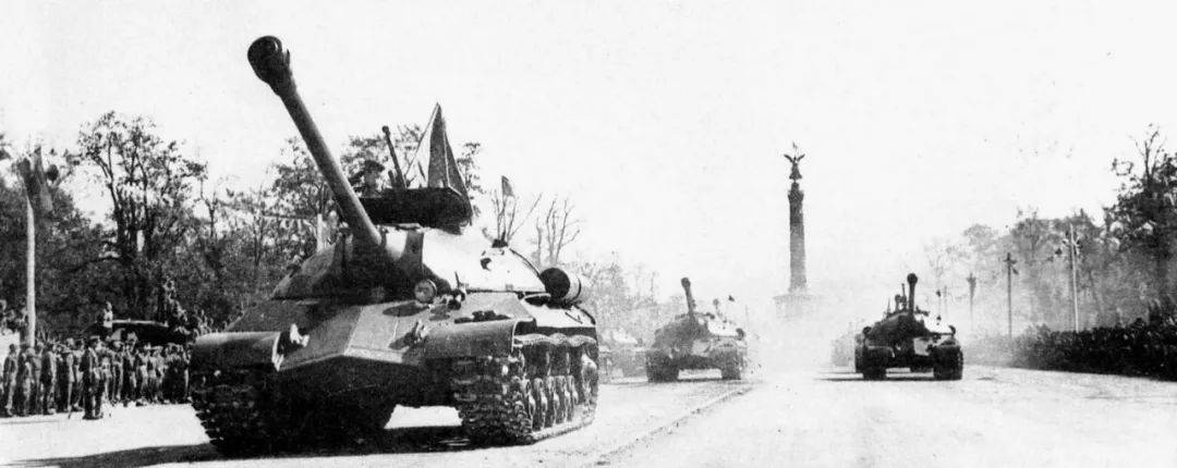 1945年德國戰敗投降的7月21日,由蘇聯提議,蘇聯、美國、英法四國在德國首都柏林舉行了一次勝利閲兵活動。閲兵時,蘇聯首次公開展示了52輛IS-3重型坦克,這款威力強大的坦克讓英美大為震驚。美國方面參加的主要是第82空降師和第16機械化騎兵羣。