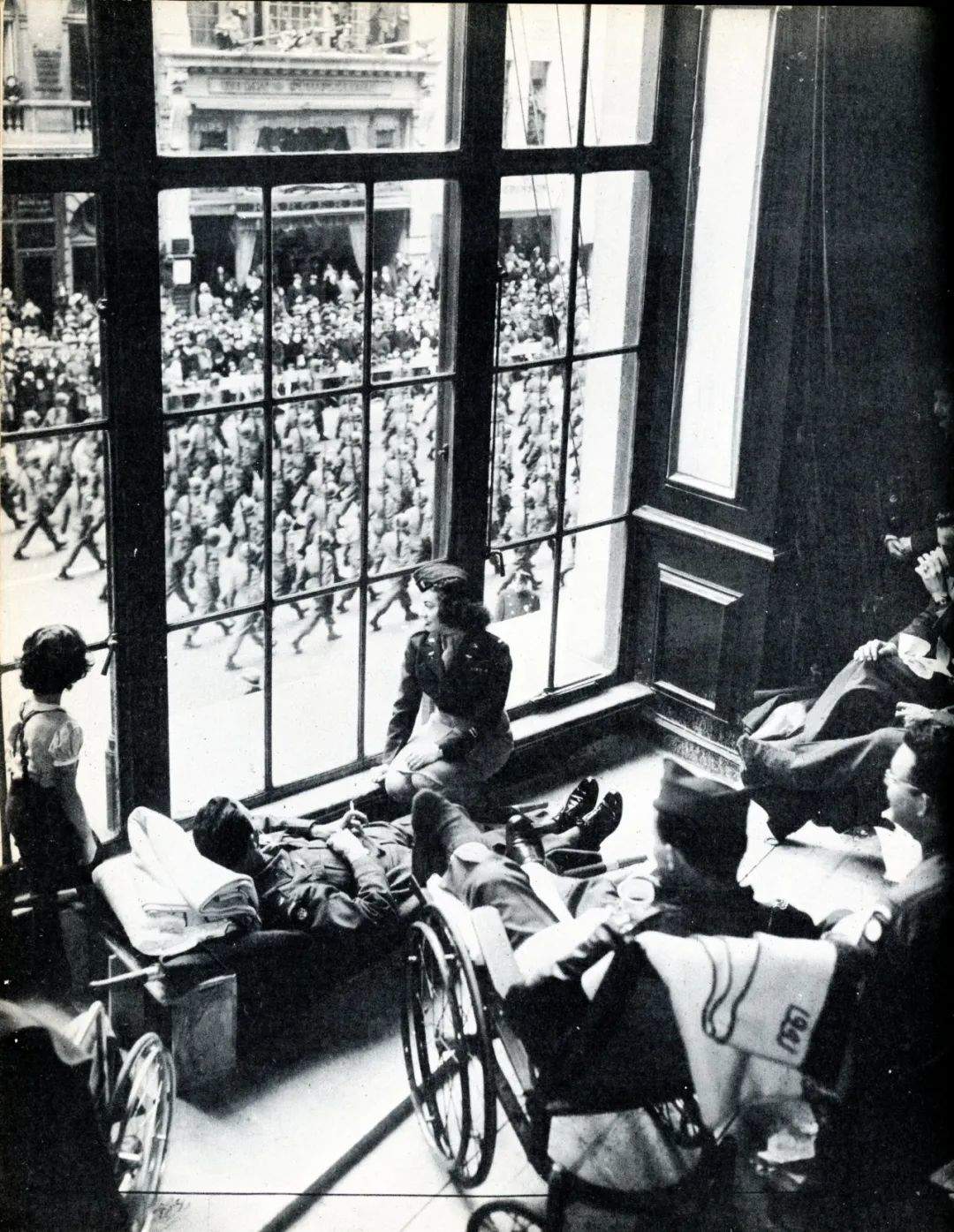▲受傷的士兵在窗前觀看勝利閲兵