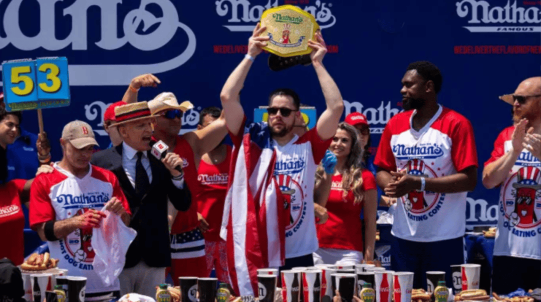 ▲對了,在美國國慶日有個傳統活動“吃熱狗大賽”,今年的男子組冠軍是帕特里克·貝爾託萊蒂,他十分鐘內吃掉了58個熱狗。女子組冠軍是日裔的須藤美貴,她10分鐘吃掉51個熱狗,已經連續10次衞冕冠軍。