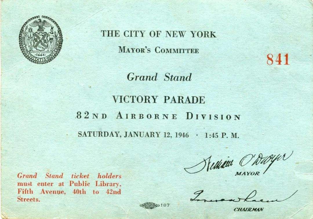1946年紐約再次舉行慶祝二戰勝利結束閲兵遊行,閲兵部隊是第82空降師,因為該師號稱“全美師”,兵員來自全美48個州,所以被選為代表美國軍隊參閲。