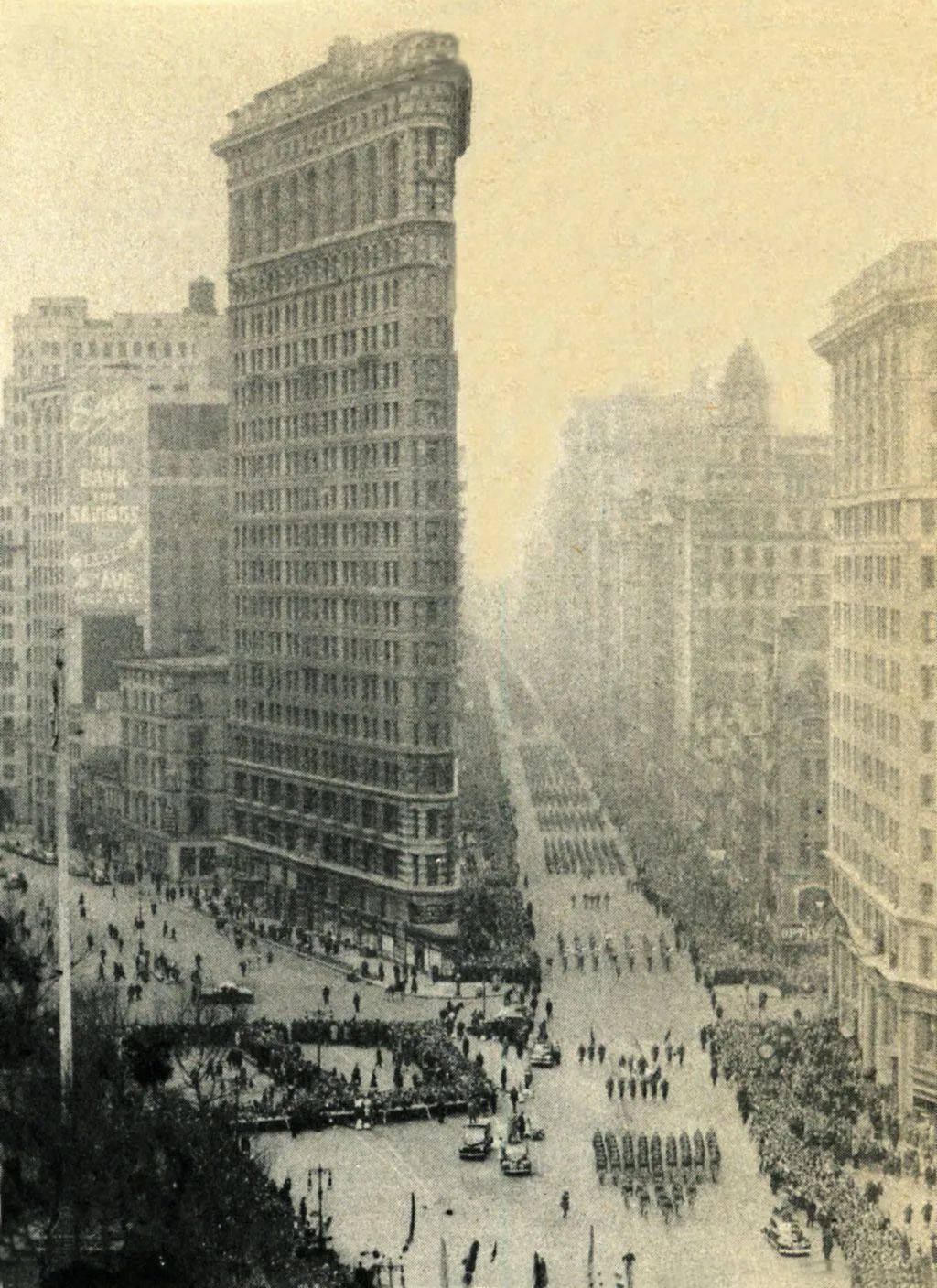 ▲閲兵遊行隊伍經過曼哈頓的標誌性建築之一“熨斗大廈”,這座大廈高91米,共22層,完工於1902年。