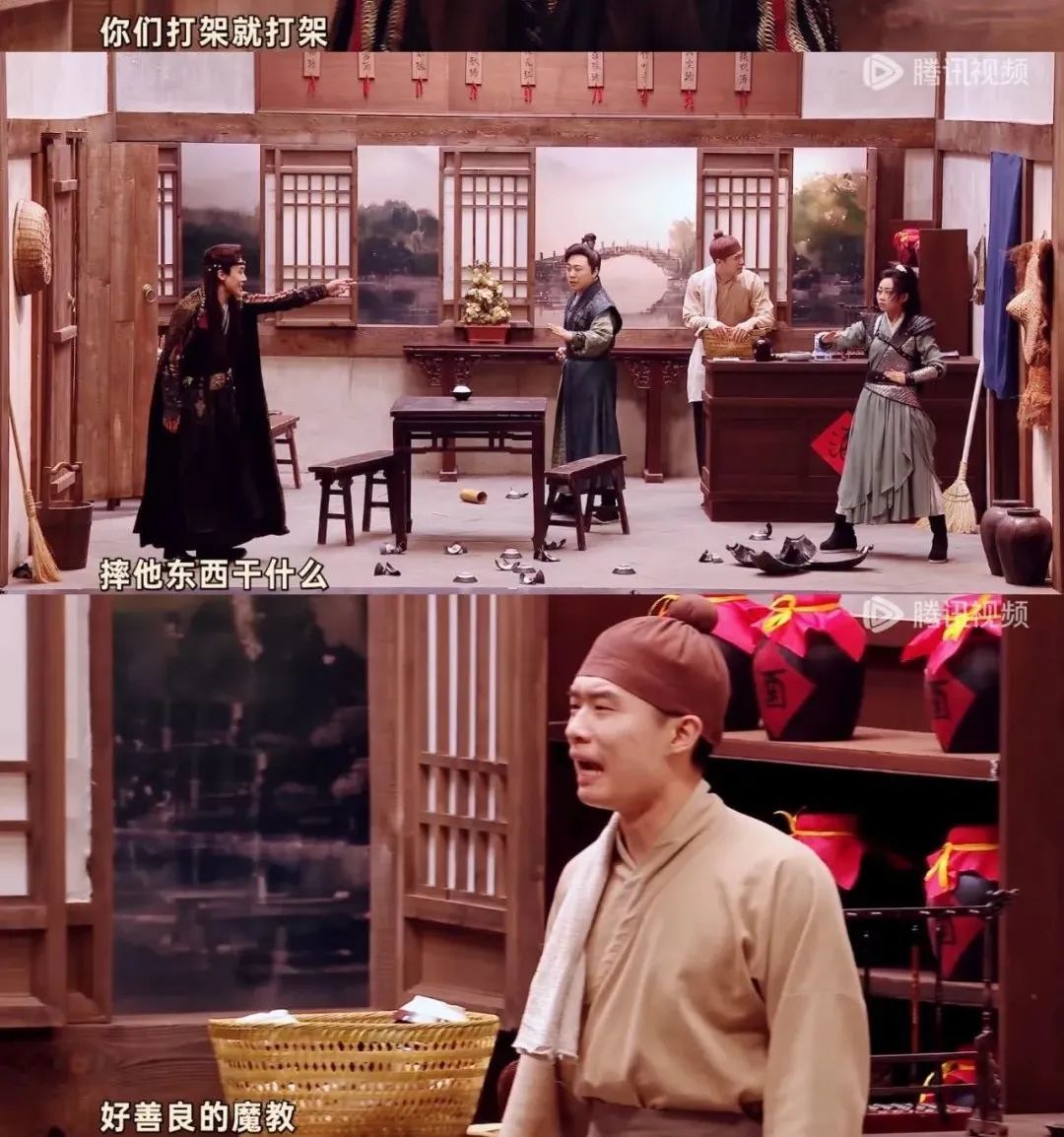 武林大俠在店裏談事兒,總是一會兒摔一個碗,讓店小二無奈又痛心。還對不損害碗甚至幫忙接住碗的魔教教主產生好感,決心加入魔教。