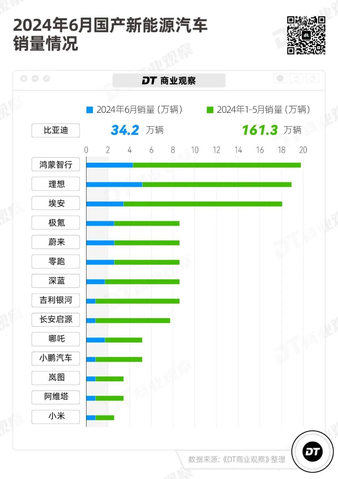 《DT商業觀察》統計了部分新能源汽車品牌的銷量情況。