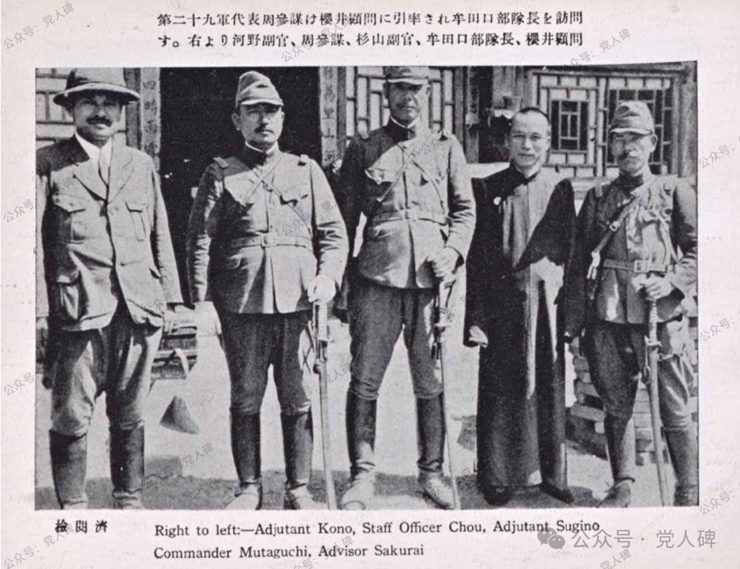 七七事變後,正在交涉的兩軍人員,左二即挑起事變的甲級戰犯牟田口廉也