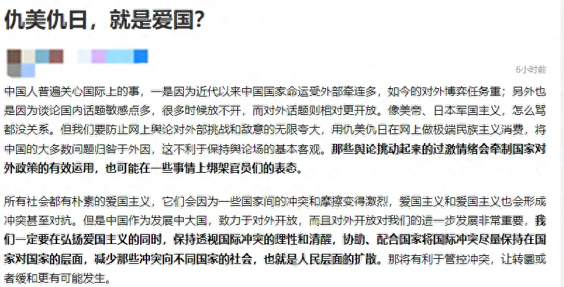 現在好了,這位大V一篇莫名其妙的《仇美仇日,就是愛國?》的文章,網友們都在討論什麼行為才算是愛國,甚至為此吵得不可開交。