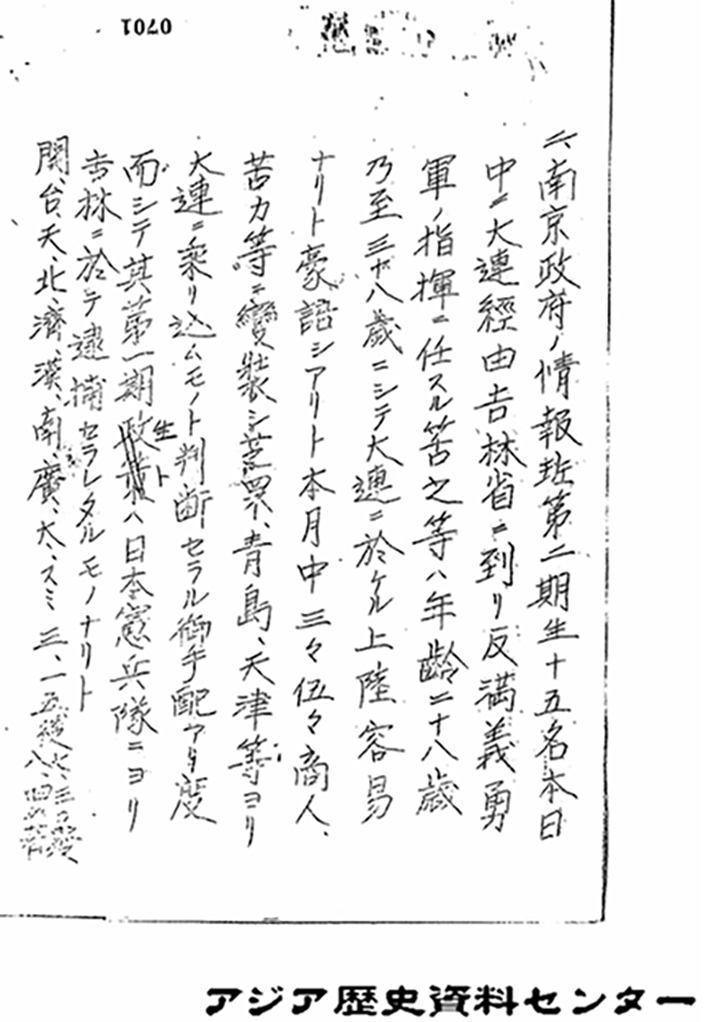 第二、南京政府情報班第二期學員15名,本日經大連到達吉林省,去擔任反滿義勇軍的指揮等,年齡十八至三十八歲,他們豪言壯語説在大連上陸容易,本月內三三兩兩化裝成商人苦力等,從山東煙台芝罘、青島、天津等地,乘船到大連。根據判斷和安排而定。其第一批學生即被日本憲兵隊逮捕于吉林的關、台、天、濟、漢、南、廣、太。
