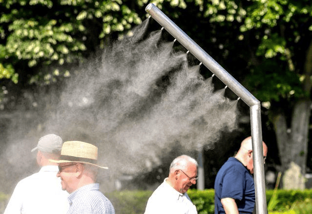 ▲歐洲紳士們不顧紳士,在街頭的水霧噴頭下降温