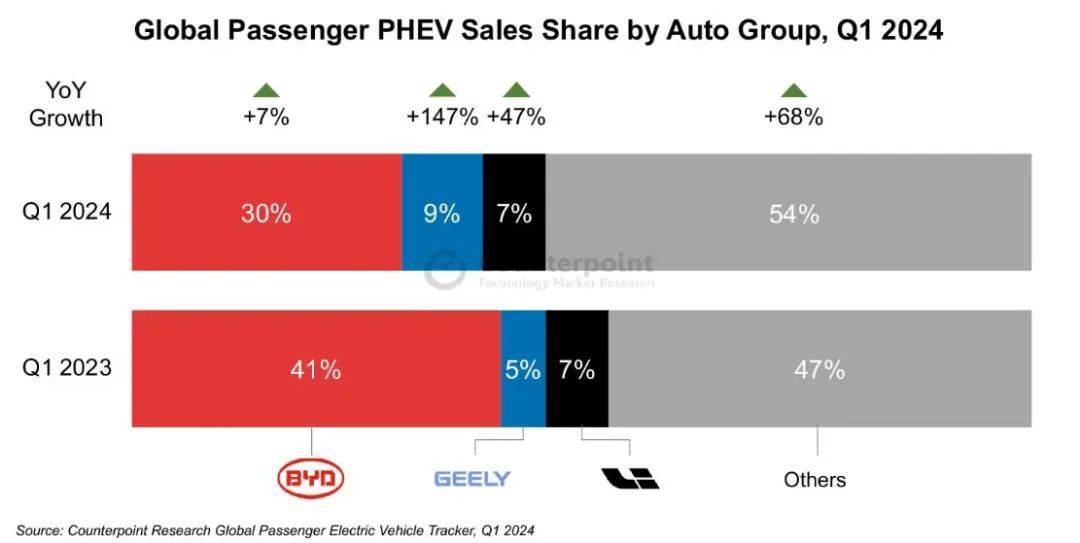 調研報告顯示,比亞迪在插電混合動力汽車領域表現出色,佔據了全球近三分之一的市場份額。吉利控股和理想汽車緊隨其後。