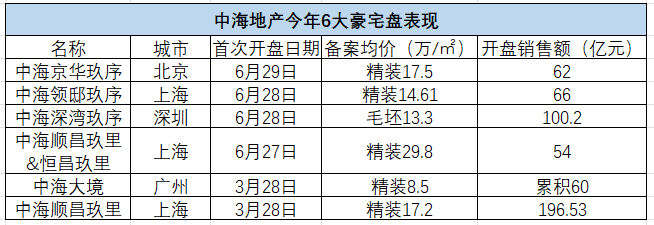 今年的3月初和6月底,中海統一開了兩次大盤,集中在北上廣深推出了6個項目,銷售額加起來超過600億元大關