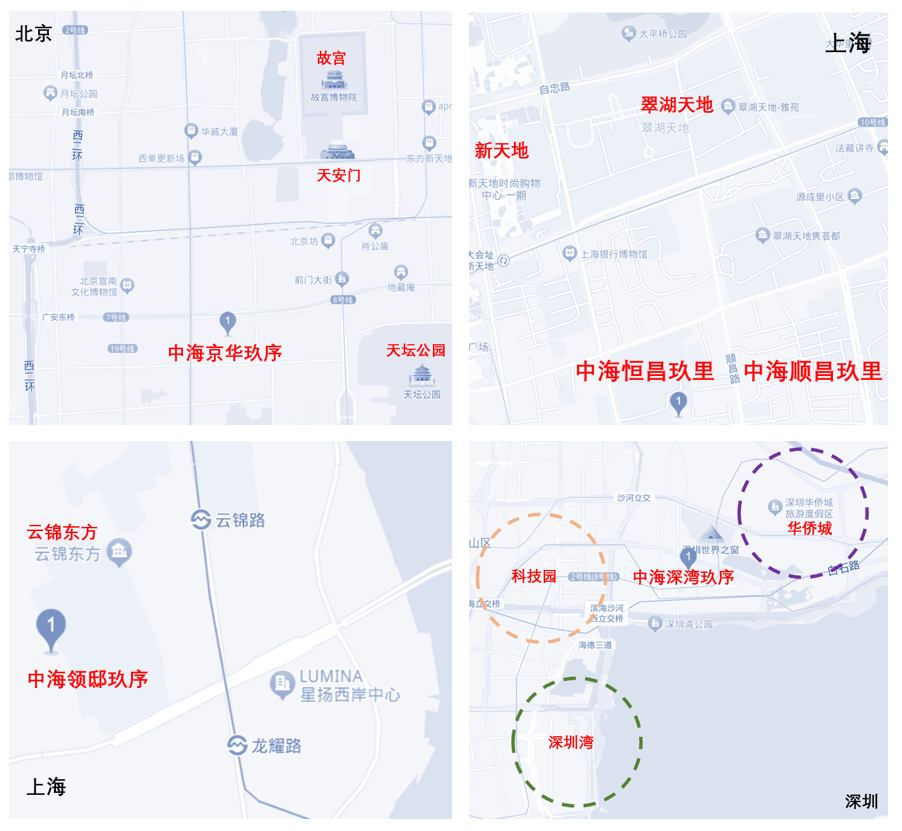 上海的中海順昌玖裏和恆昌玖裏,前面就是翠湖新天地,中海領邸玖序則位於徐匯濱江
