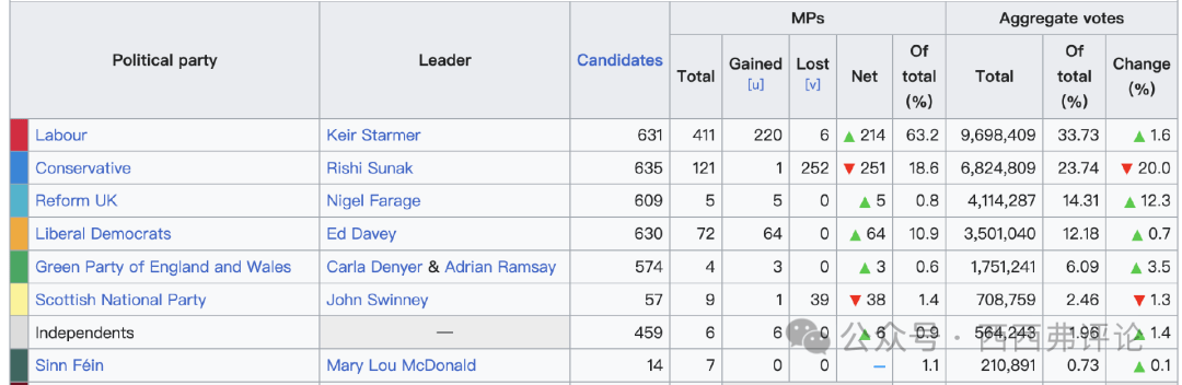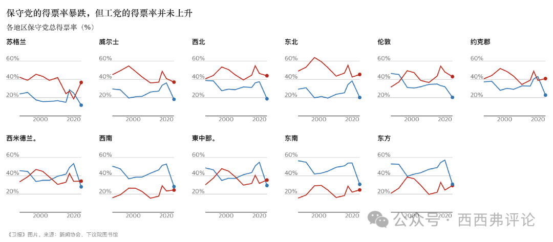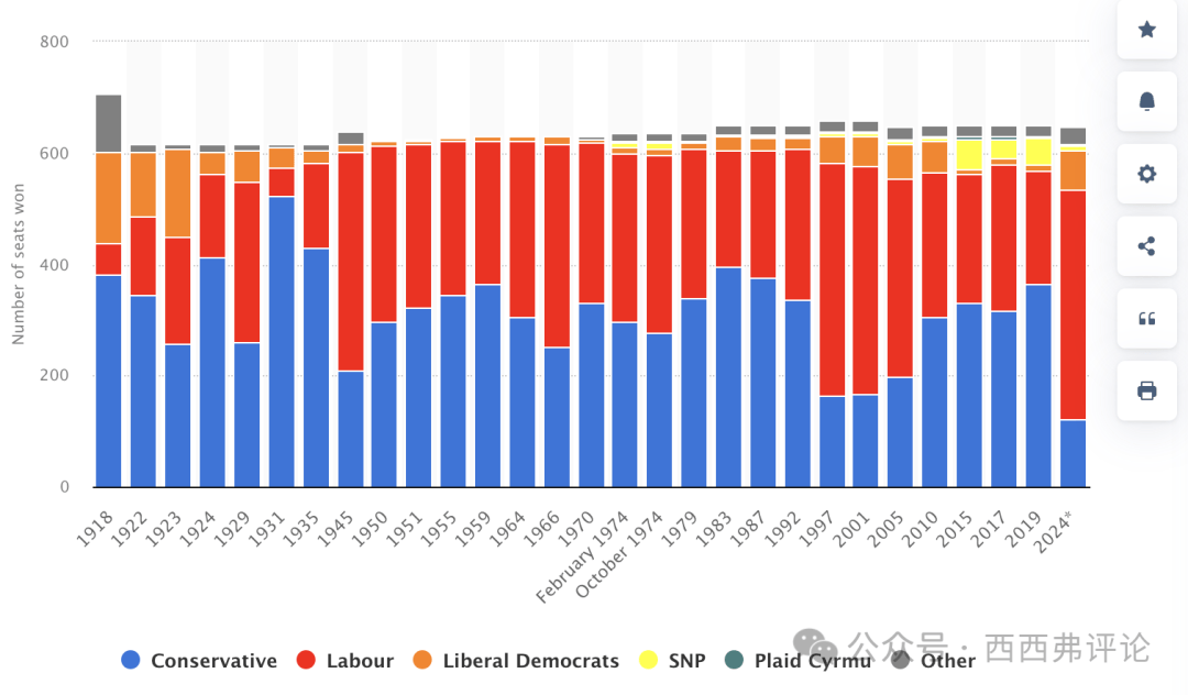 這次保守黨的失敗,並不是輸給了工黨,而是因為英國極右翼黨派,選擇黨的崛起。選擇黨(前身是脱歐黨)獲得的選票,從2019年的2.0%,上升到2024年的14.3%。而選擇黨獲得的額外12.3%的選票,基本上都是從保守黨這邊搶走的。