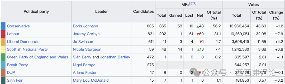 2019年選舉,保守黨獲得了43.6%的選票,和56.2%的議會席位。